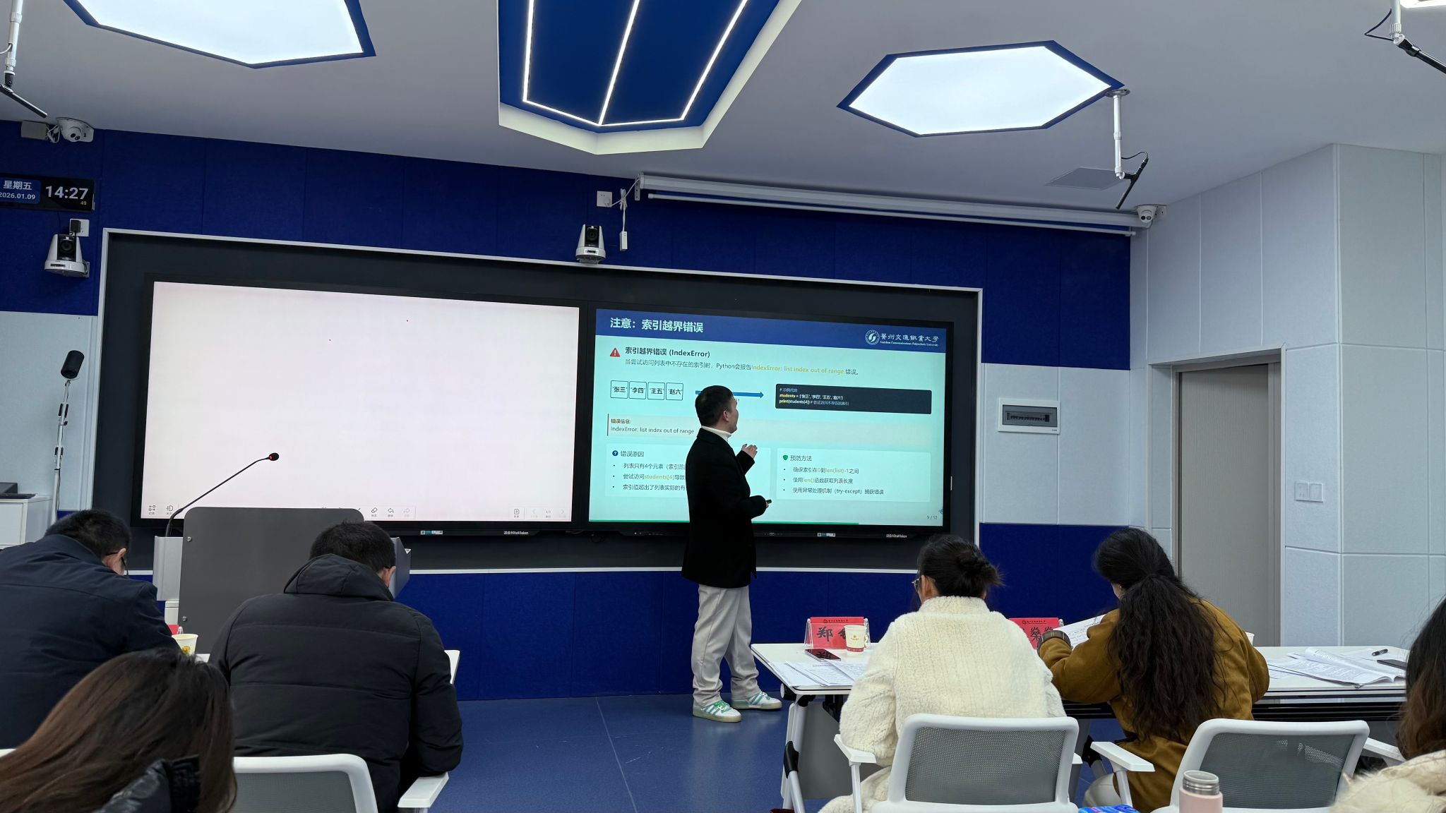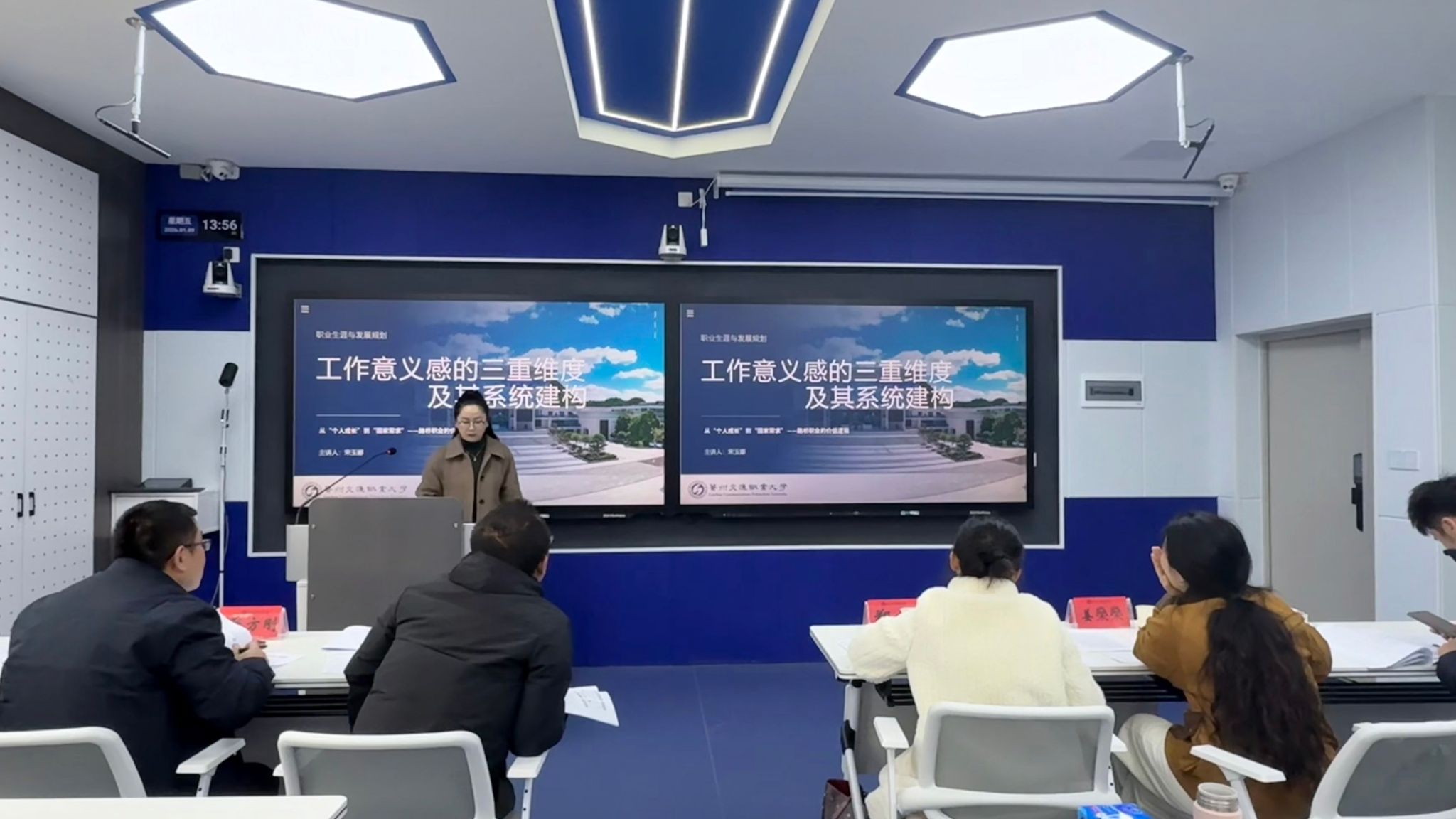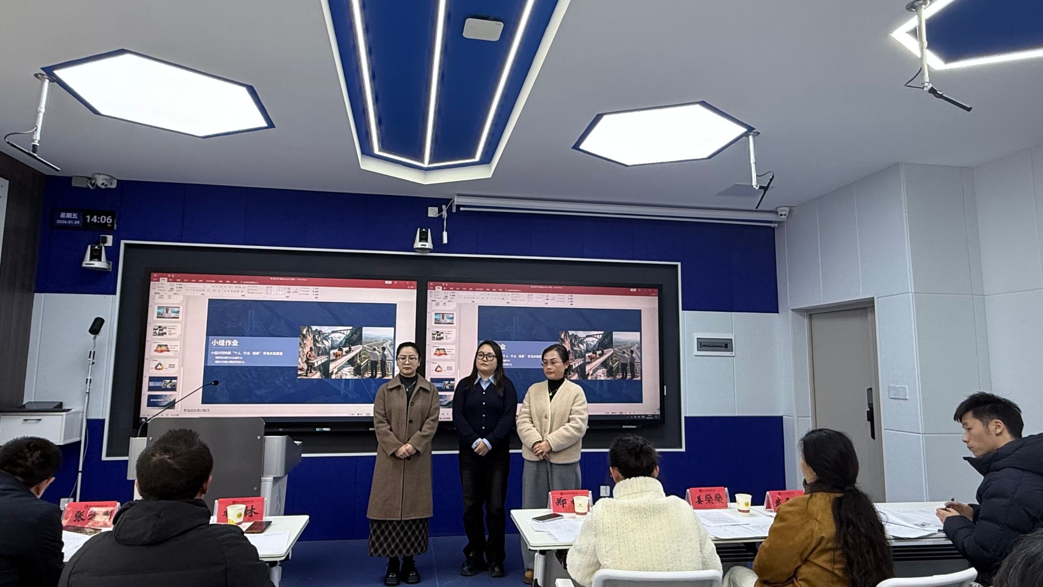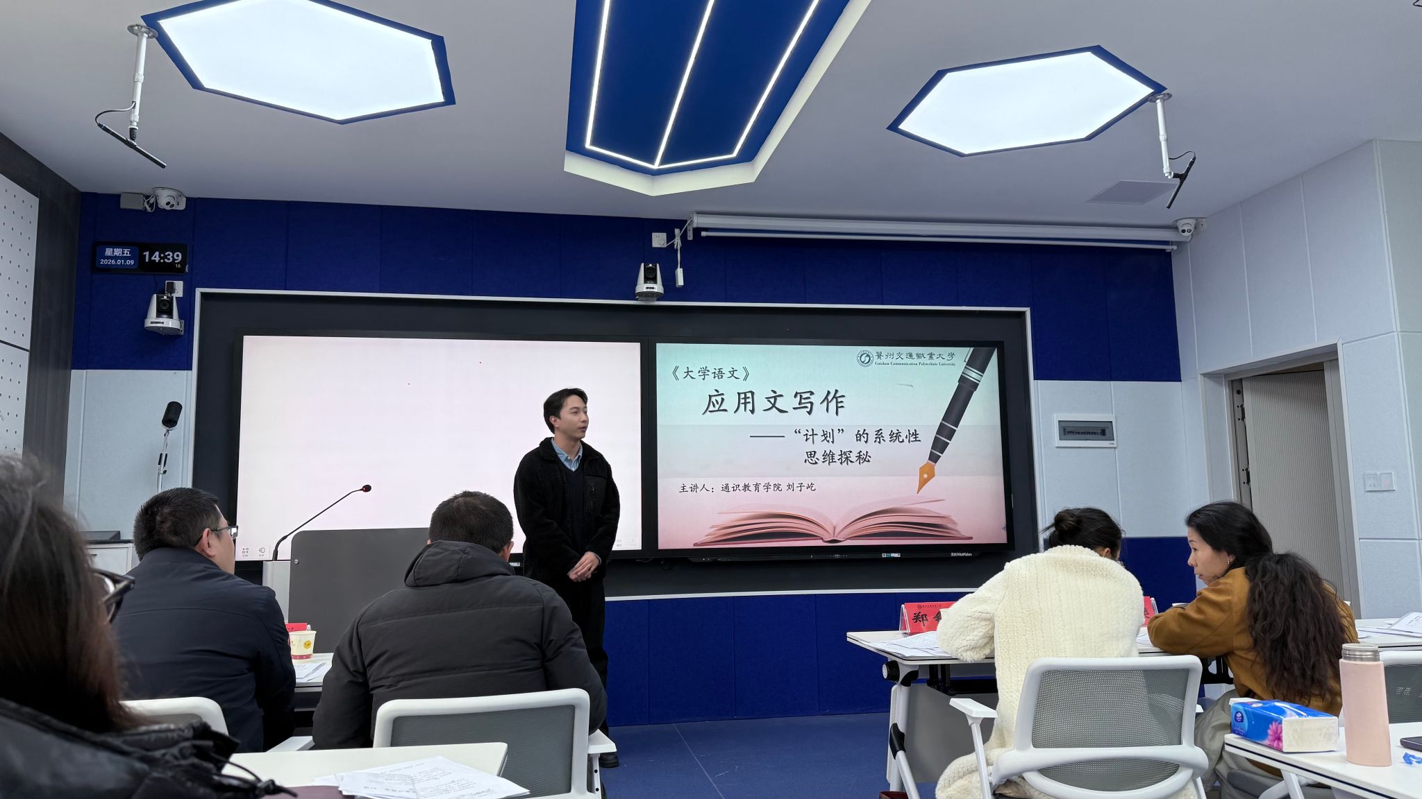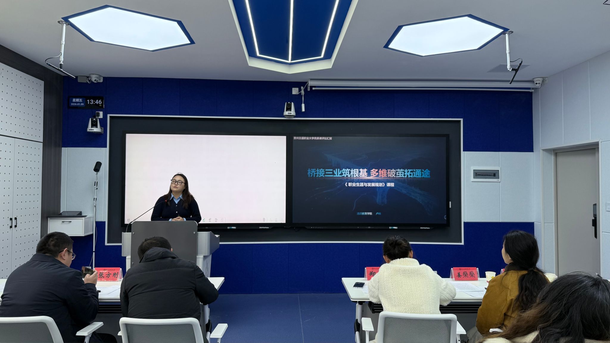 1月9日,校级优质课程现场评审工作在学校勤通楼102智慧教室、博通楼401同步开展,标志着本次评审工作进入关键收尾阶段。现场评审环节聚焦课程建设实效,设置课程建设陈述、教学授课展示、专家提问答辩三大核心模块,全方位考察申报课程的教学设计、实施效果、特色创新及示范价值。参评教师围绕课程目标、内容体系、教学方法、资源建设等方面详细阐述建设思路,通过现场授课直观呈现教学风采,在专家提问环节精准回应核心问题,充分展现了我校教师深耕课程建设、潜心教书育人的良好风貌。评审专家对每门课程进行细致点评,既肯定亮点特色,又针对性提出优化建议,为课程后续提升指明方向。